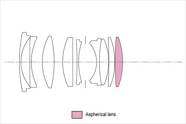 The optical pattern consists of nine elements in 8 groups, including aspherical lens.
